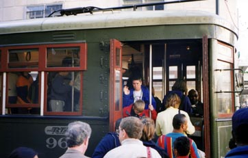 After lunch, we spent a long time heading through downtown and out past Tulane University (and a few other sites) on the trolley (a national historic ride). We went the full 13.2 mile length one way (to a dead end) and then we got out, boarded the same trolley and headed all the way back. Here is James and Pam disembarking from our final stop (where we started):