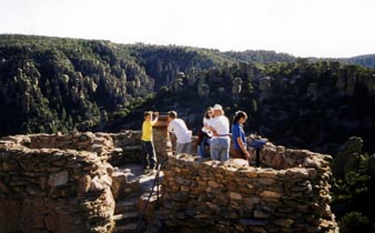 On Sunday afternoon we drove up to the Chiricahua National Monument (pronounced CHEERY-COWA). This was about a forty minute drive across desert terrain ending with a jaunt right into the side of a mountain. Eh oh, another trip up the side of a mountain! It wasn't nearly as bad as the cliff dwellings. When we got to the top we were able to see all the incredible rock formations. What a creation! The different things we have been able to see on this trip are astounding. This looked like a spread out, mountain version of the city of rocks. Here we are at the overlook: