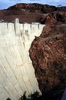 The plan for the day was to head up to the Hoover Dam, followed by a trip into Las Vegas and a stop at the Vegas KOA. The first stop was the Hoover Dam. Unfortunately, we hit some pretty heavy traffic heading into the dam (and probably some of it into Arizona to keep travelling, since there is really no other way to get into the northwest of Arizona). We had to drive to the Arizona side of the dam because we weren't 'just a car'. The good news was the parking was free. The bad news was it was a fair ways from the dam. Everyone took the trek down to the dam (except for Pam, she waited in the car and read a book). This was definitely a place to be very careful. There were reasonable safeguards from just falling over, however, there really was nothing to stop someone from just hopping up and hopping over. Mind you, if you hopped off the Lake Mead side, it was only about a 20 foot drop. The other side was more like this (those small things crossing the dam are indeed transport trailers):