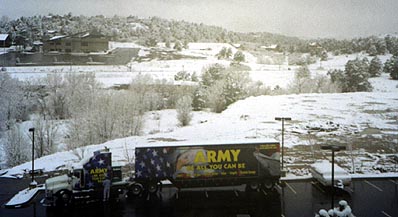 We had a funny incident at the Holiday Inn Express where we were staying. A couple of US Army guys had moved our trailer from where we had originally put it. Fortunately, David just happened to have disconnected the extra brake (it is usually on), or else they might have damaged something. They did a good job moving the trailer so they could make room for their rig. Here is a dual-purpose picture, showing the US Army vehicle (our trailer, which used to be about where the middle of their truck is), taken from the third floor window where we were staying. Notice that we had another big snowfall overnight (second in a row). Probably about 5" of snow this time: