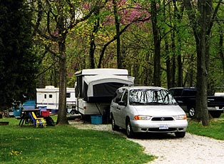 The campsite is very nice. We were situated just up a little hill from a pond. The trees are just coming out, including some pretty pink ones. Here is a picture of the campsite: