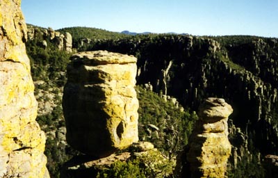 On Sunday afternoon we drove up to the Chiricahua National Monument (pronounced CHEERY-COWA). This was about a forty minute drive across desert terrain ending with a jaunt right into the side of a mountain. Eh oh, another trip up the side of a mountain! It wasn't nearly as bad as the cliff dwellings. When we got to the top we were able to see all the incredible rock formations. What a creation! The different things we have been able to see on this trip are astounding. This looked like a spread out, mountain version of the city of rocks. Here we are at the overlook: