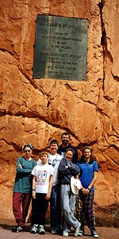 The next day we went to the Garden of the Gods and wandered about. Here's a family shot (thanks to Kathie taking the picture), at the rock that has the plaque thanking the donator of the entire park to the city of Colorado Springs: