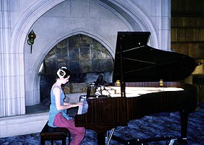 This location has a retreat facility as well as a main administrative building. Apparently, Billy Graham had been instrumental in helping negotiate the purchase of this property for Dawson Trotman and the Navigators back in the 50's. The property and the buildings are quite spectacular. Reba particularly like wandering around and exploring. Here she is in the great hall ready to perform (her future career of music and singing):